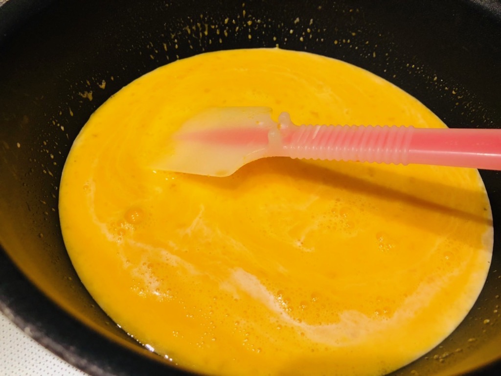 ④鍋のあら熱が取れたらボールに卵を割り、よく割ほぐしてから先ほど温めたものと混ぜ合わせ、こし器でこします。