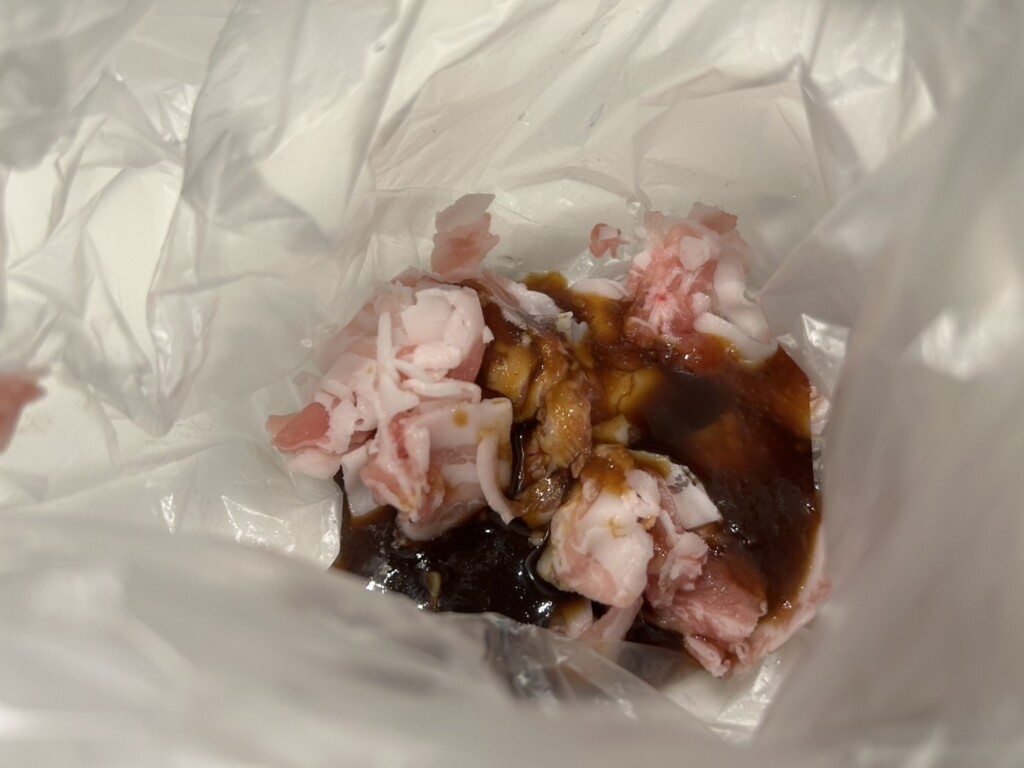 ②ビニール袋に豚肉を入れ、焼き肉のたれを入れて揉み込んで5分ほど