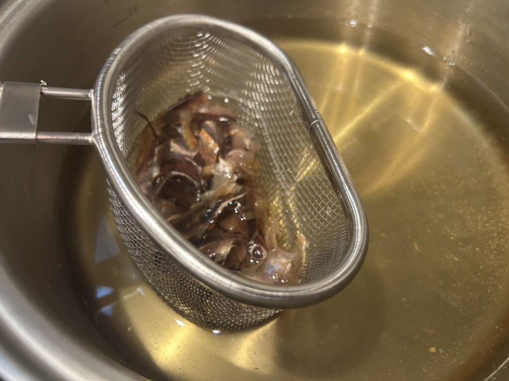 鍋に水1リットルを入れ、鰹節を20グラムほど入れたら弱火で5分ほど煮て火を止め、鰹節を取り出します。白だしを入れて少し濃いめの味になるように調節します。