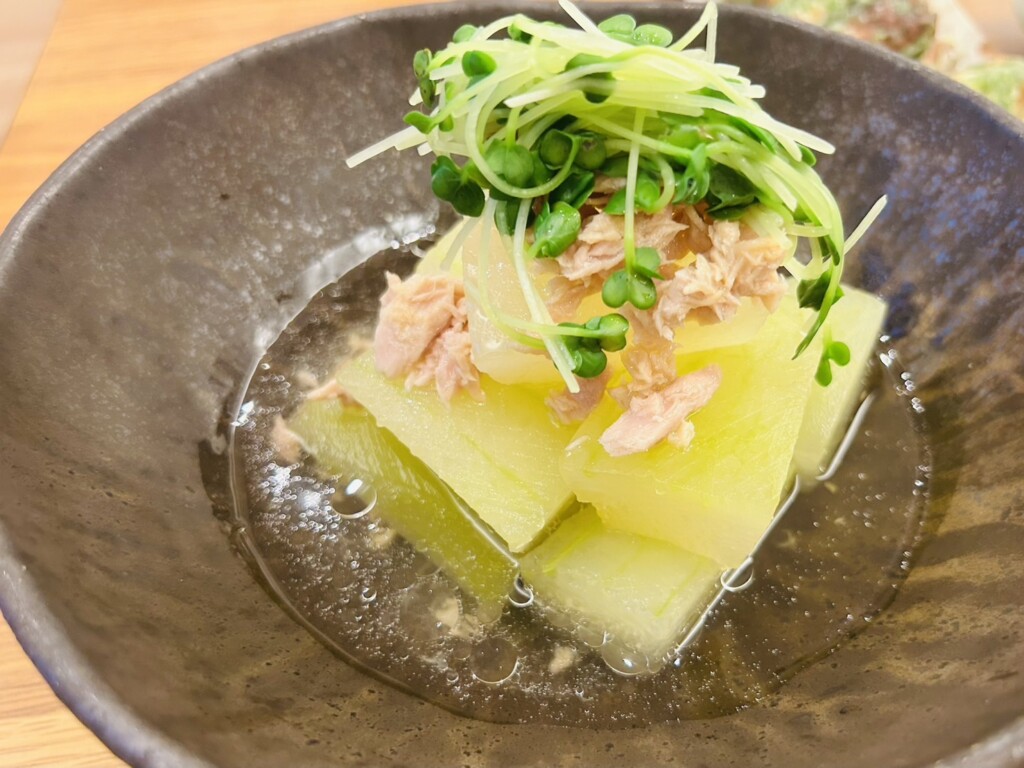 器に冬瓜を盛り付け、ツナ缶を乗せ、かいわれ大根を乗せたら完成です。