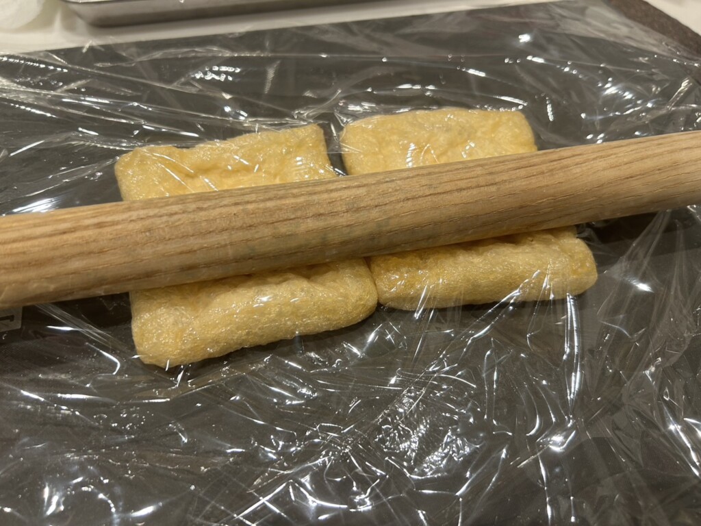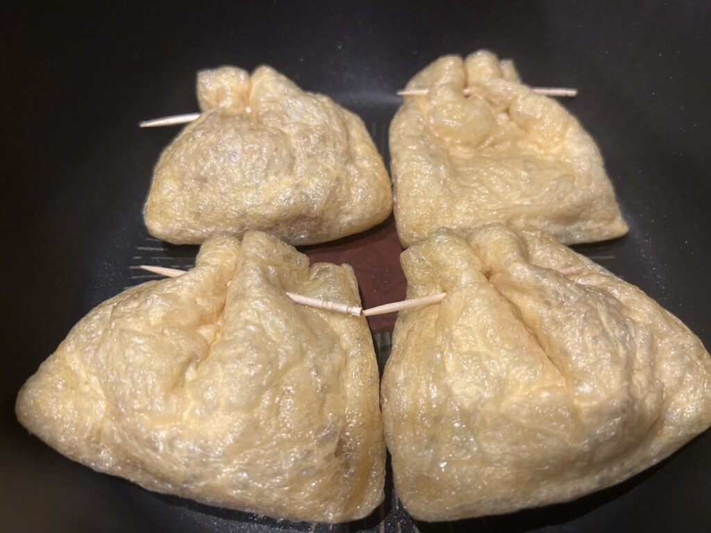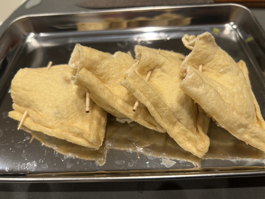 ①の納豆を4分の1ずつ詰めて爪楊枝でとめます。