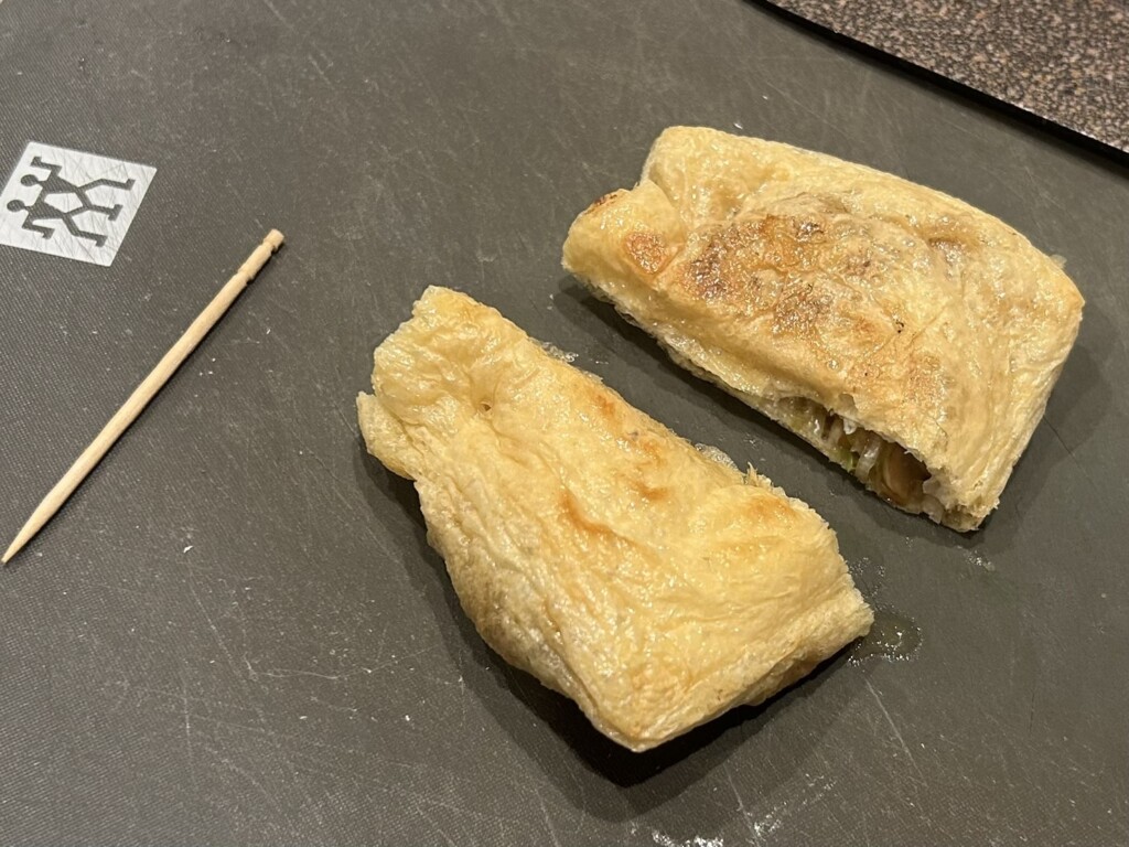 ⑤つまようじを取り除き、半分に切って皿に盛り付けたら完成です。