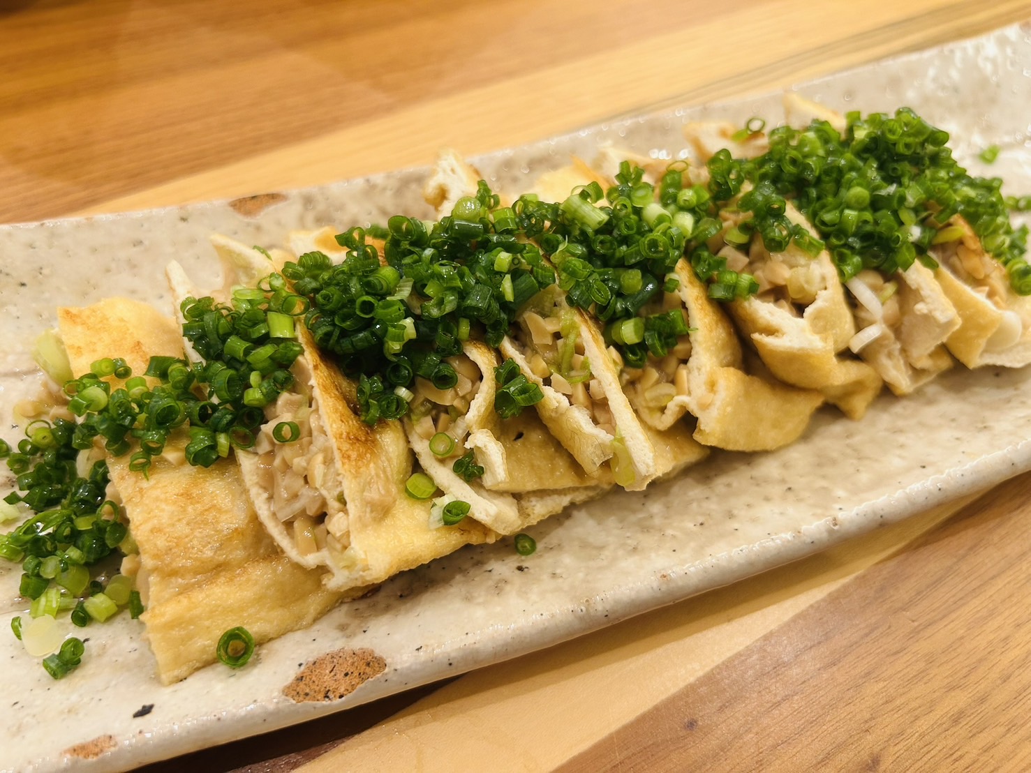 ①の納豆を4分の1ずつ詰めて爪楊枝でとめます。