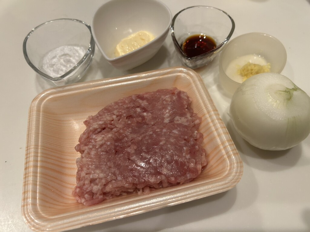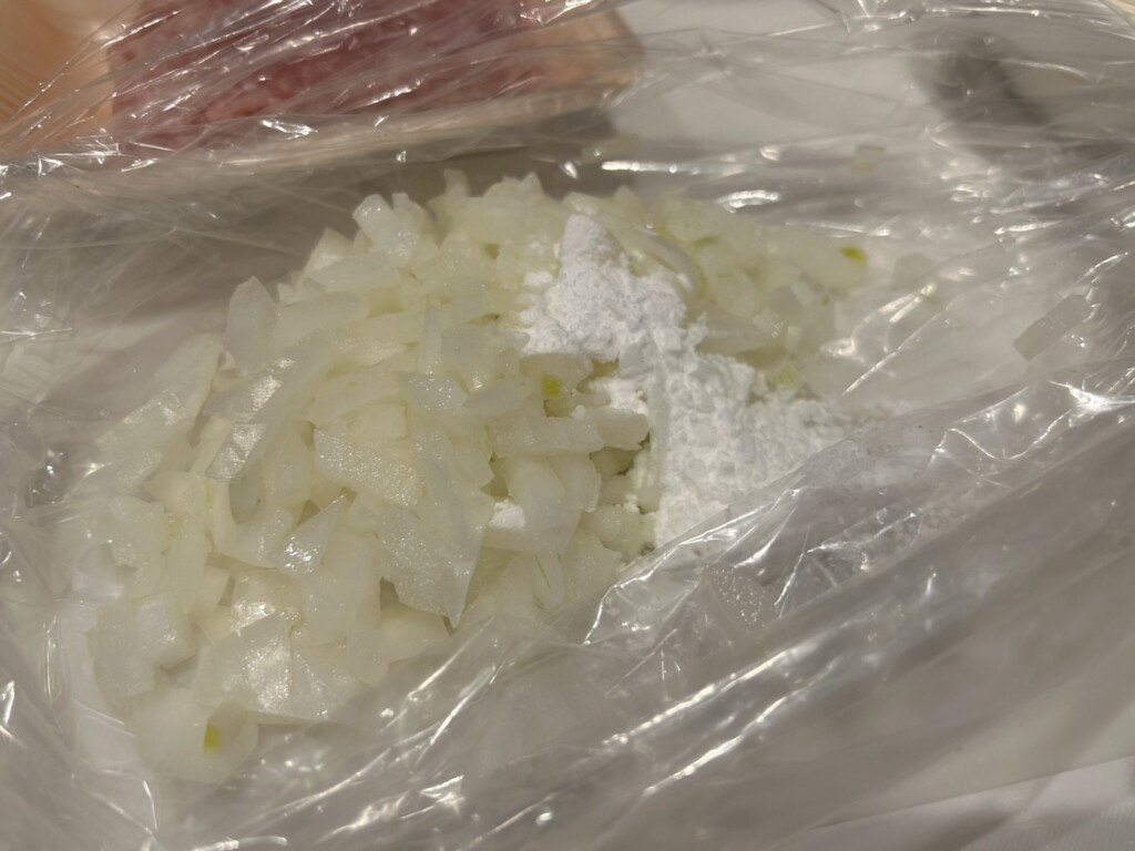 ①玉ねぎをみじん切りにし、ビニール袋の中に入れ、片栗粉大さじ1をまぶしておきます。