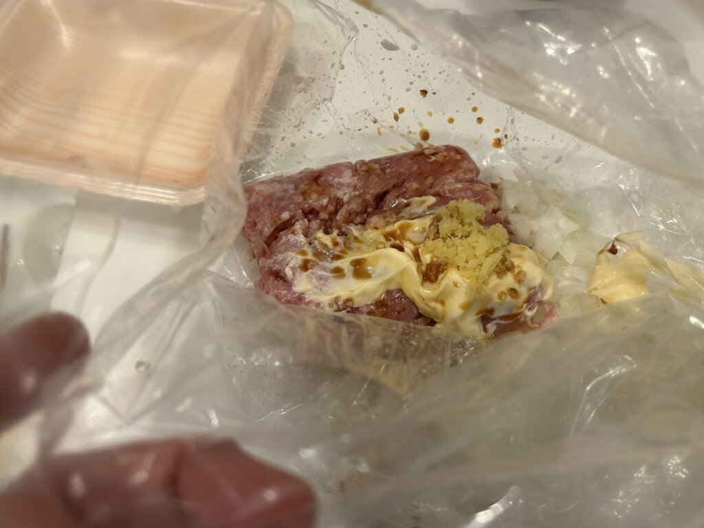 ②もう一つのビニール袋を用意し、鶏もものミンチ、マヨネーズ大さじ1、