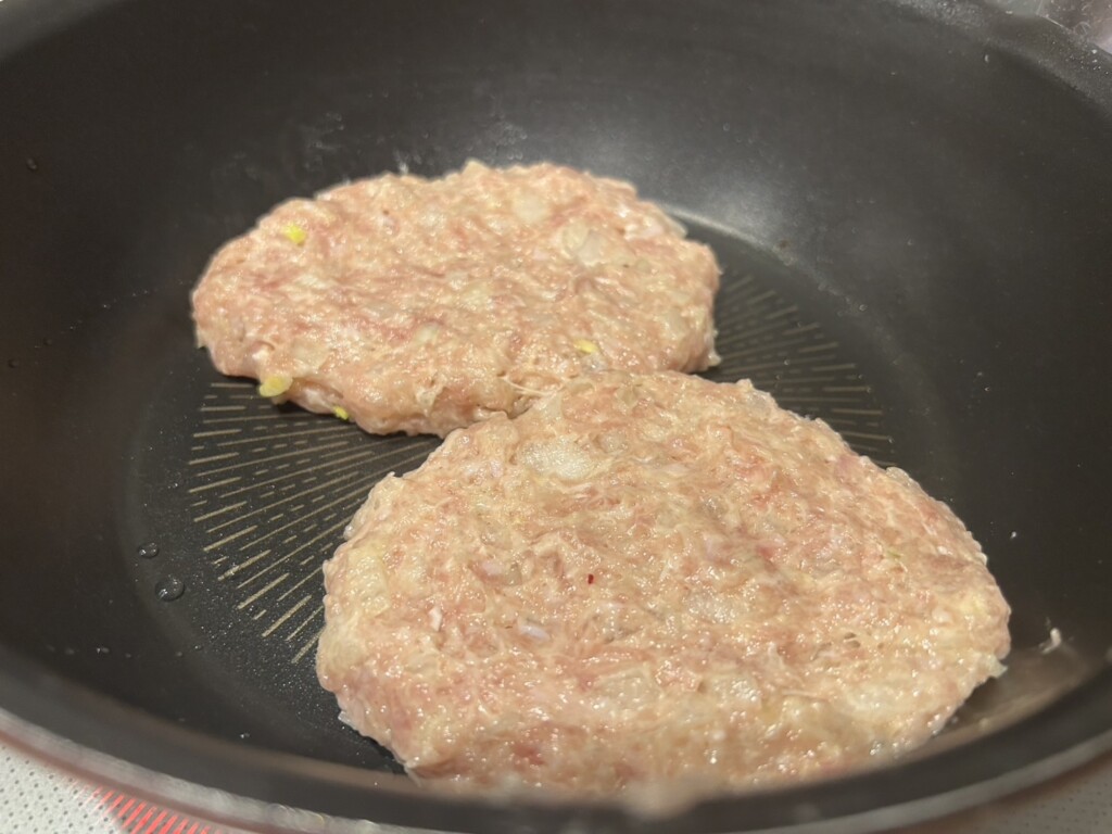 ③①と②を混ぜ合わせ、2等分にしてフライパンで焼きます。