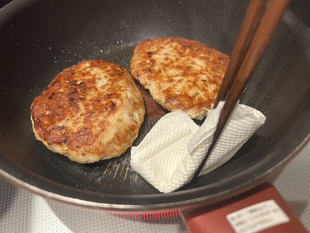 ④チキンが焼けたらフライパンの中の油をクッキングペーパーなどで拭き取り、