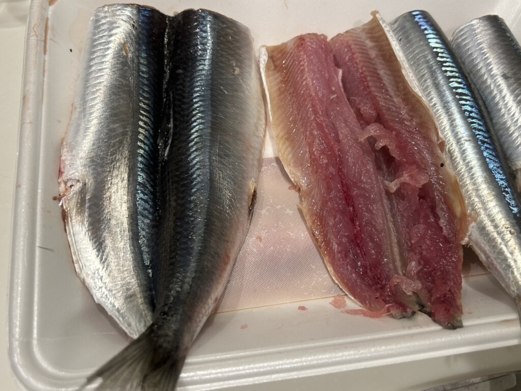 ①イワシの頭を落とし、骨を取り背ヒレも取っておきます。