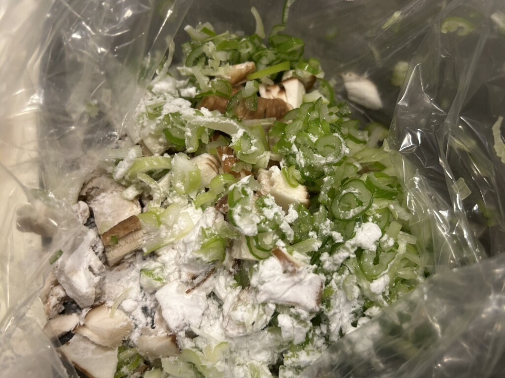 ④刻んだ野菜をビニール袋に入れ、片栗粉大さじ2をまんべんなくまぶしておきます。