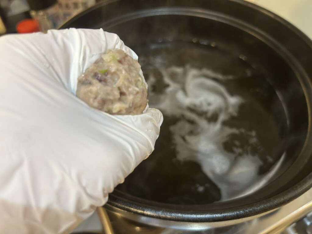 ⑤鰯と野菜、生姜を混ぜ合わせ、沸騰した鍋の中に1つずつ団子にして入れていきます。