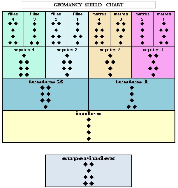 ゲオマンシーシールドチャートで、過去を表す右の「証人(testes 1)」にはシンボル「カウダ・ドラコニス」が出ています。未来を表す左の「証人(testes 2)」には「トリスティシャ」が現れました。そして「裁判官(iudex)」は「ヴィア」です。