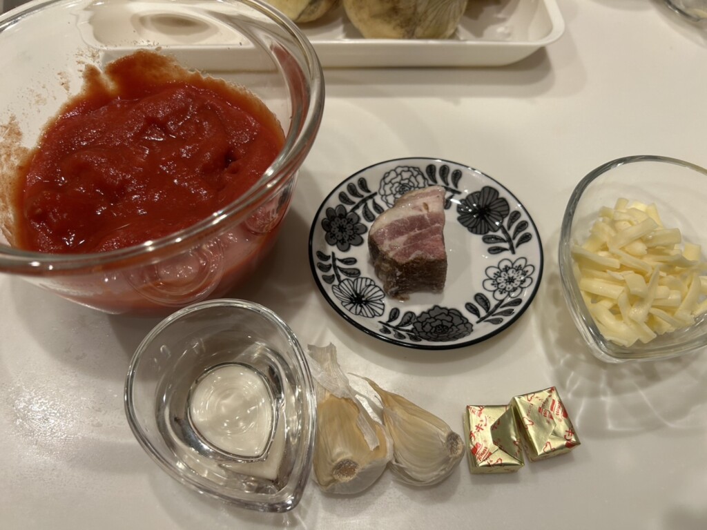 ⑥フライパンにニンニクとベーコンを入れ、油を少々入れて香りが立つまで火を入れます。