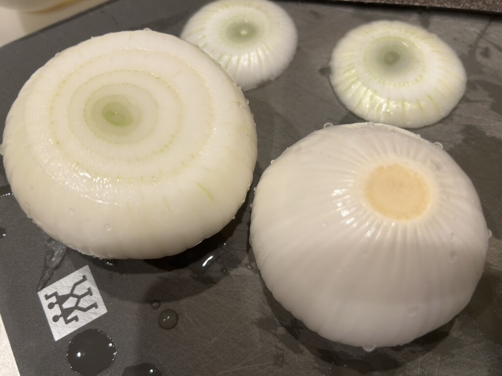 ①玉ねぎの上下を切ります。