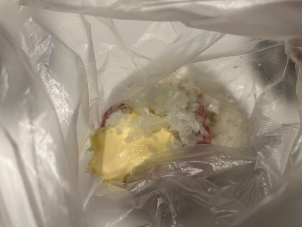 ③豚のミンチと塩麹、マヨネーズを混ぜ、みじん切りにした玉ねぎを入れて混ぜ合わせておきます。