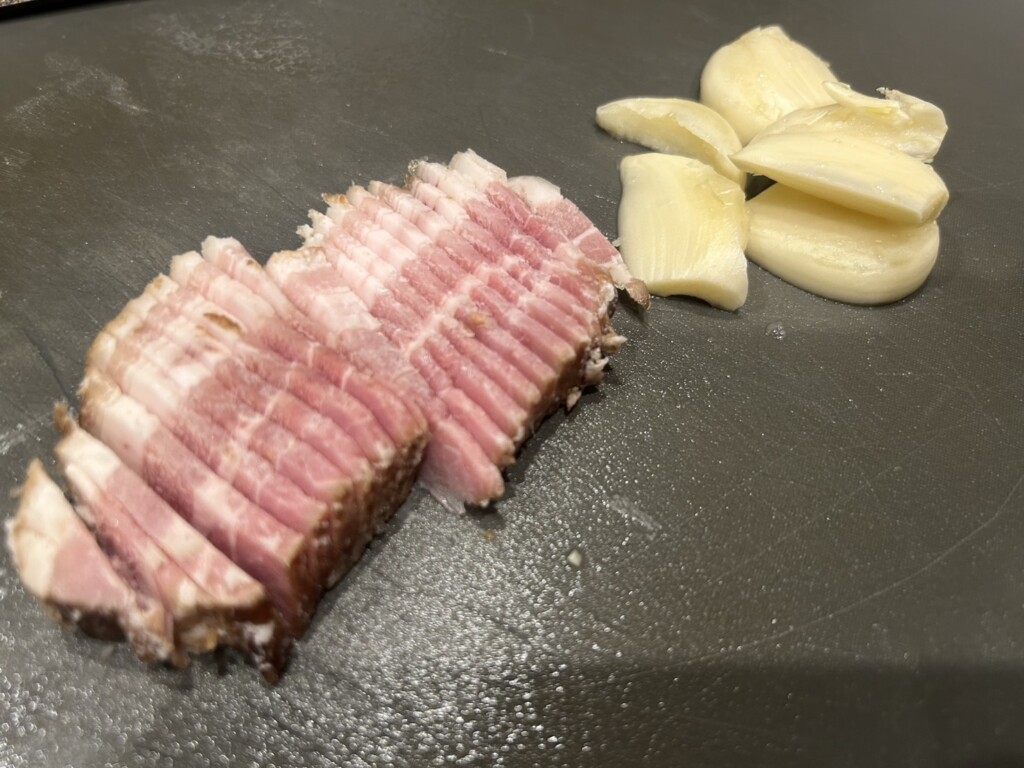 ⑤ ニンニクを薄くスライスし、ベーコンもスライスします。
