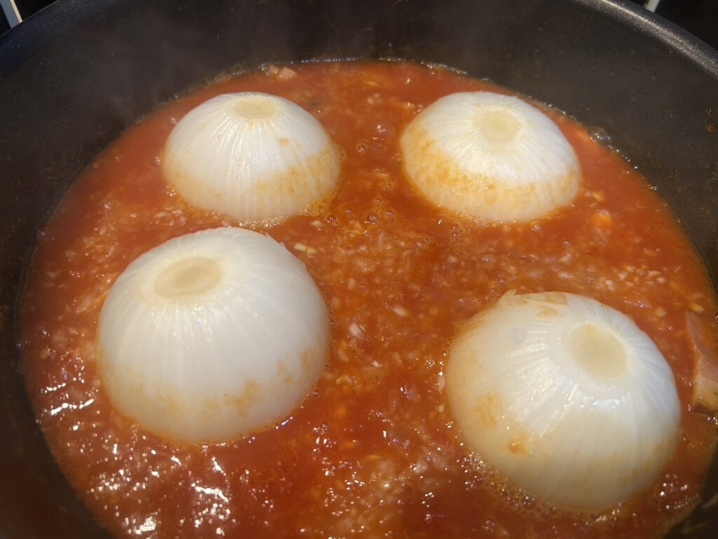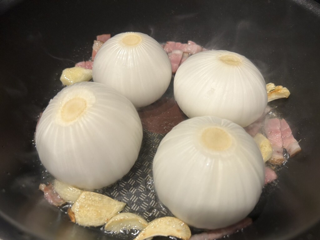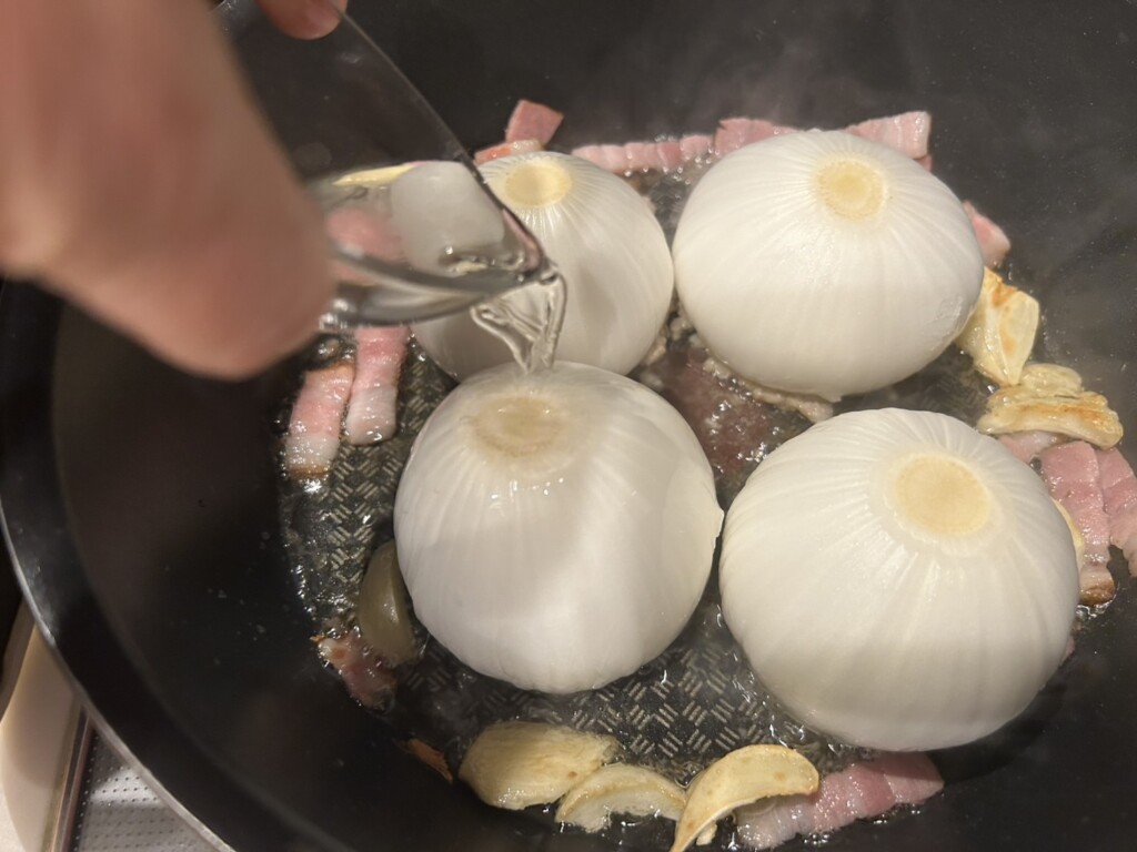 お肉を詰めた玉ねぎを肉の部分を下にしてフライパンに入れます。