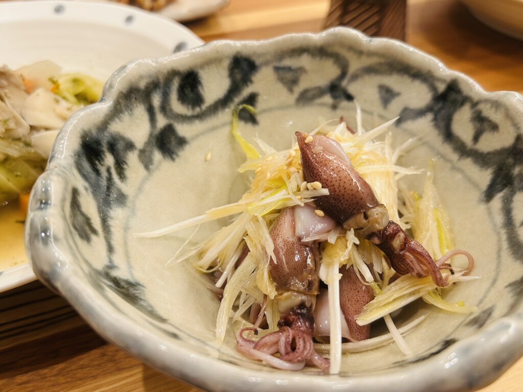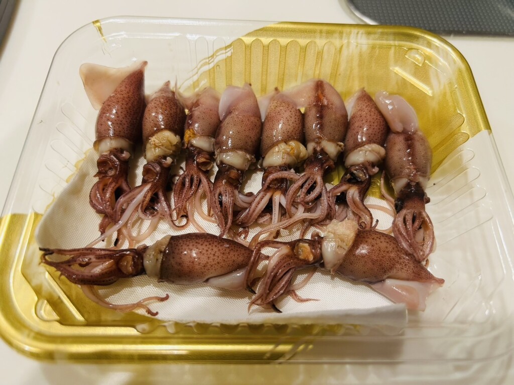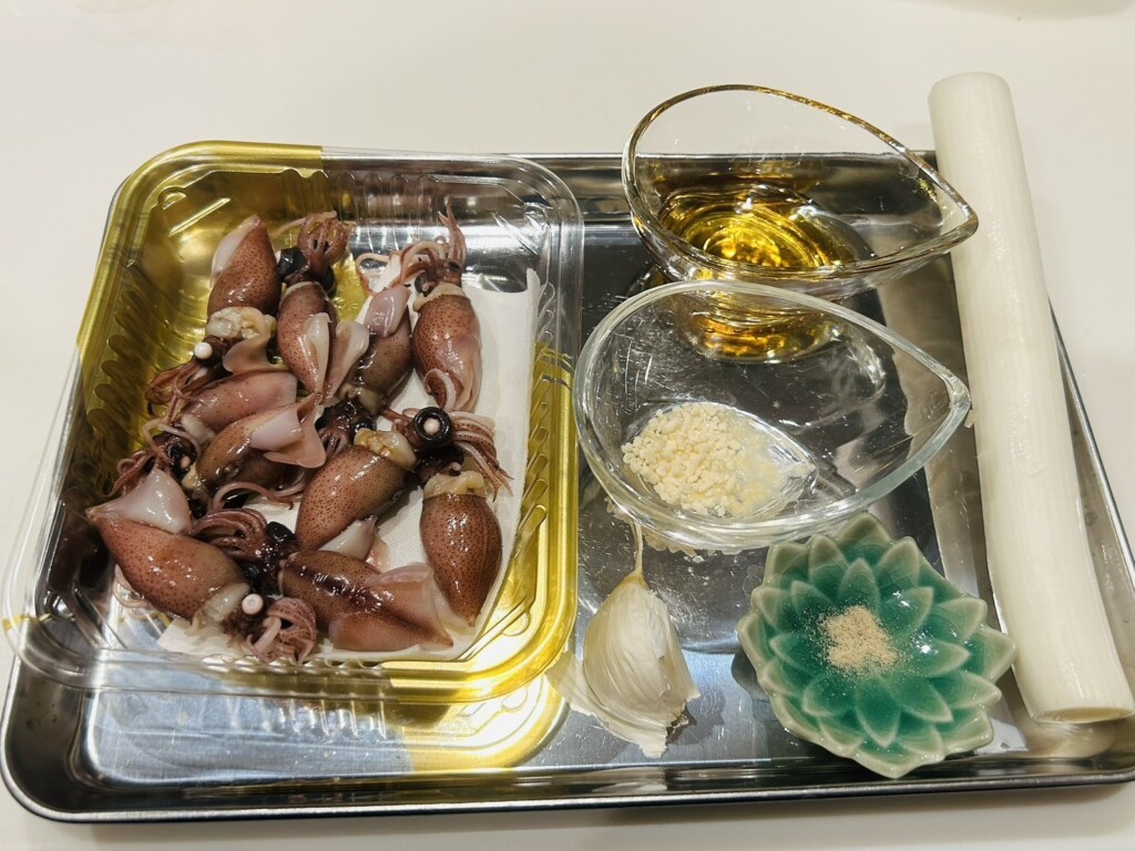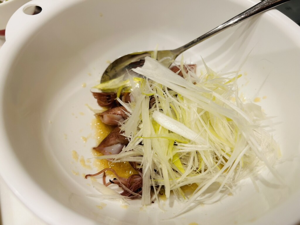 ④ホタルイカと白ネギを入れ混ぜ合わせて完成です。